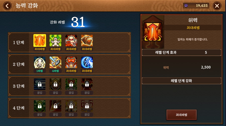 주간 구매 제한이 있기 때문에 전부 풀로 사서 하나씩 순차적으로 강화하시기 바랍니다. 실제로 노강 상태와 2단계 이상으로 강화한 상태에서 생존력 차이가 심하게 나기 때문에 능력 강화도 공격력보다는 생존에 집중된 부분부터 강화하시는 걸 추천드립니다.