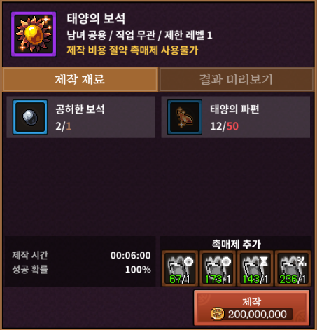 우선 태양의 보석입니다. 재료 중 가장 만들기 쉽고 일일 재료만 구매하면 만들 수 있습니다. 시간만 들이면 되는 보석이기 때문에 모든 재료 중 가장 난이도가 낮기도 하죠. 두번째 이미지처럼 상점 -> 바람 만물상 -> 보석함에서 구매할 수 있습니다. 일일 구매 제한이 있어 약 1달 반 정도를 잊지 않고 사셔야 됩니다.