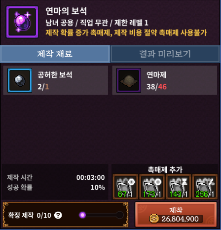 하지만 연마제로 만든다 한들 이 보석 역시 확률이 10%이므로 천장을 노리는게 좋습니다. 따라서 토벌대 상점에서 판매하는 다른 아이템은 보지 마시고 보석을 만들 때까지는 무조건 연마제에 올인하시는 걸 추천드립니다.