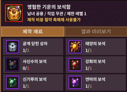 제작 -> 기타 -> 영험한 기운 탭을 누르면 확인할 수 있는 보석함의 모습입니다. 이미지에서 알 수 있듯 굳게 닫힌 상자를 포함한 5개의 보석을 모으면 만들 수 있는 아이템인데요,