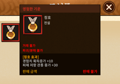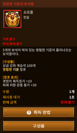 정확히는 칭호 아이템으로 보석함을 만들고 개봉하면 이렇게 "영험한 기운"이라는 칭호를 얻을 수 있습니다. 경험치 획득 10과 피저관 30이면 절대 무시할 수 없는 스펙이기 때문에 바연을 하시다보면 자연스럽게 만들기 시작하게 되죠. 하지만 전설 칭호인 만큼 난이도는 어마무시하게 어렵습니다.