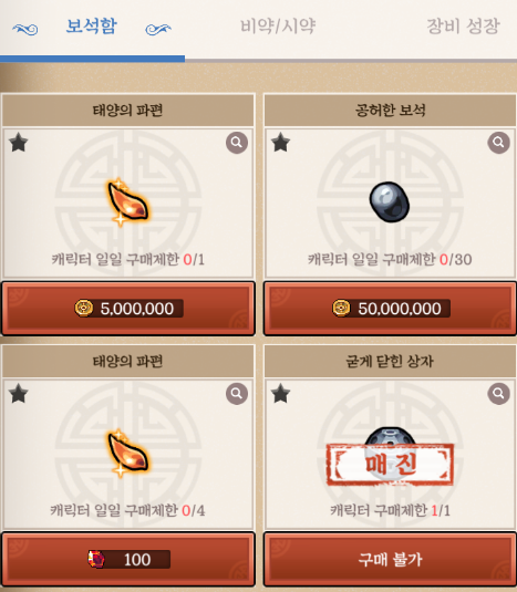 사신수 보석은 진짜 극악의 운빨을 기대하거나 오랜 시간을 갈아넣어야 만들어지는 아이템이므로 주기적으로 인장 상자를 구매하면서 재료를 모아주시기 바랍니다.