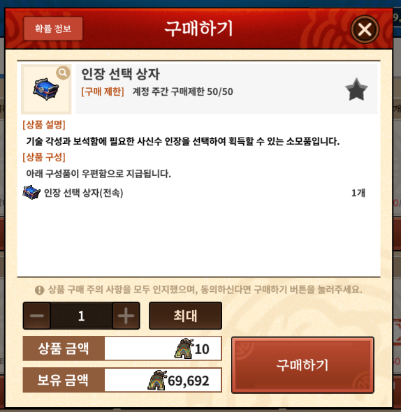 도삭산 주화로 인장 선택 상자를 최대 50개까지 구매 가능하며 50개를 모두 까면 한 번에 인장 500개를 얻을 수 있습니다. 3주 모아야 1,500개인데 4신수로 만들어야 하니 12주, 즉 3달에 1번 트라이가 가능합니다.