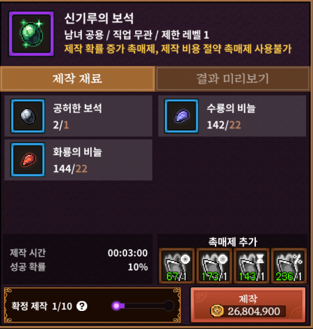 모든 보석 중 최고 난이도를 자랑하는 사신수의 보석입니다. 이름 그대로 재료로 사신수의 인장이 들어가고 각각 재료가 1,500개 이상씩 들어가는데 확률은 여전히 10%로 극악의 난이도를 자랑하는데요,