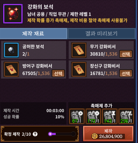 다음은 강화의 보석입니다. 각종 강화 비서만 재료로 쓰이니 얼핏 보면 굉장히 쉬워보이지만 이 보석의 함정은 바로 장신구 강화 비서와 확률입니다. 장신구 비서는 필드 드랍도 되지 않고 상점에서 사거나 월드 보스에서만 수급이 가능하므로 수급처는 충분하지만 확률을 뚫어야 하기 때문에 난이도가 소폭 상승합니다.