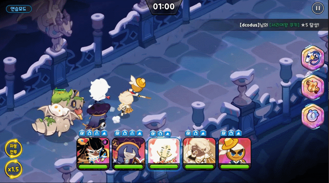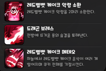 쫄 2마리를 소환하는 기술입니다. 체력 기반이 아닌 타수로 때리기 때문에 타수 공격이 높은 쿠키가 반필수로 들어갑니다. 많이 때리기만 하면 되서 비슷한 쿠키는 모두 채용할 수 있지만 현재는 마법사탕으로 버프먹은 블랙 레이즌이 그 자리를 차지했습니다.