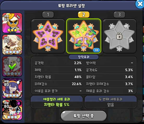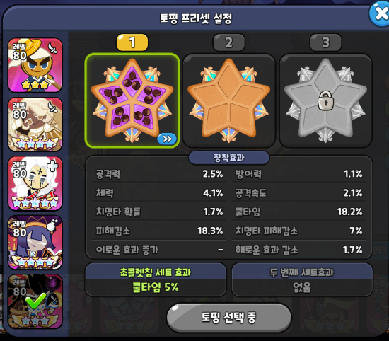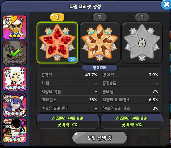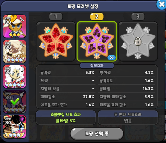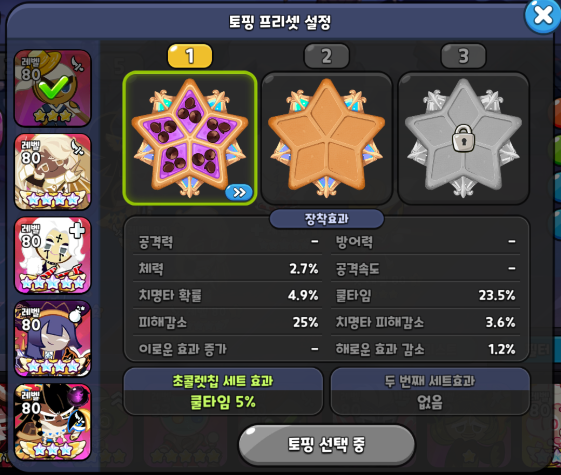 힐러 포지션 락스타맛 쿠키입니다. 락스타 토핑에 왜 치명타가 들어가느냐? 하실 수 있는데 락스타 스킬에는 본인의 치명타 확률 상승 시 아군의 전체 치확 증가 버프를 걸어줍니다. 사실 힐러겸 서포터 역할이라고 볼 수 있습니다. 따라서 쿨감은 비추천되는 세팅이며 치명타 확률 + 피해감소 위주로 가주시고 비스킷 역시 비슷하게 세팅해주시면 됩니다.