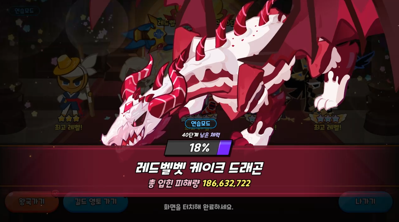 스킬 타이밍을 잘못 잡아 락스타가 빨리 죽어버리는 바람에 안타깝게도 원턴킬은 실패했습니다. 대신 이 한 판에 독뎀으로 딜이 어마무시하게 뽑히기 때문에 덱만 제대로 갖춰진다면 토벌전에서 가장 먼저 트라이하게 될 컨텐츠라고 볼 수 있습니다. 쿠키만 다 갖춰지면 저레벨에서도 빠르게 점수를 올릴 수 있기 때문에 길드원들과 점수 경쟁을 하게되면 빠르게 선점해서 순위를 올려보시기 바랍니다.
