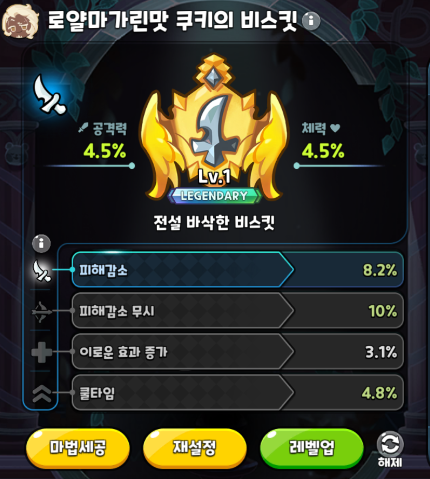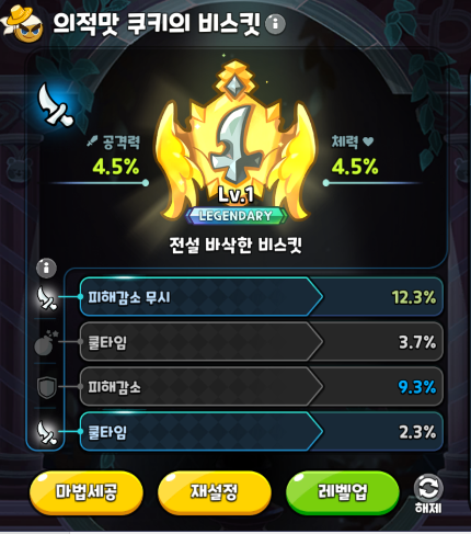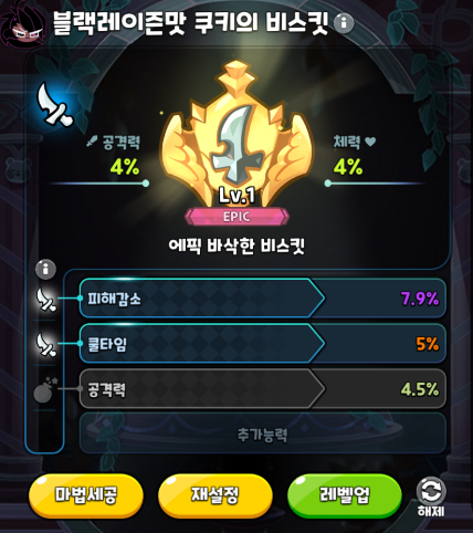 의적맛 토핑의 핵심은 쿨감입니다. 레드벨벳 레벨이 높아질수록 한방 딜에 녹아버리는 물몸은 어쩔 수 없지만 최대한 버티기 위해서는 피감도 같이 챙겨줘야 합니다. 3옵도 같이 챙길 수 있다면 치명타 확률을 챙기는 것이 좋습니다. 비스킷의 경우 4옵을 모두 맞추기는 현실적으로 어렵다보니 핵심은 쿨타임과 피해감소를 우선으로 챙겨주시면 됩니다.