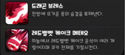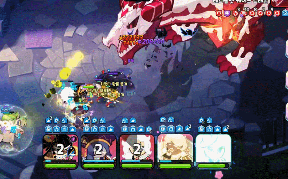 보스의 핵심 스킬인 브레스와 메테오입니다. 보통 메테오 -> 브레스 순서로 쓰며 이미지처럼 메테오로 1차 기절, 브레스로 쿠키들이 끔살당하는 구조입니다. 토핑 세팅에 따라 브레스에서 보통 다 죽기 때문에 그 전에 딜을 얼마나 넣냐에 따라 갈리게 되는 스킬이기도 합니다.