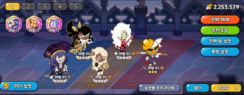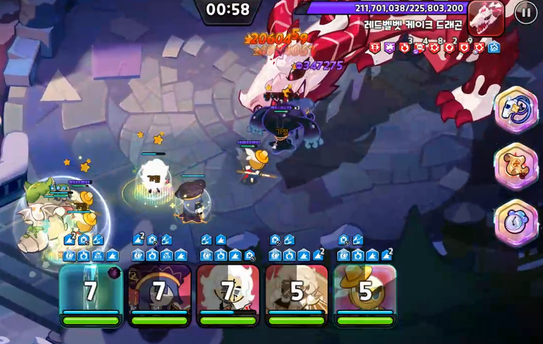 기본 덱 구성입니다. 힐러의 선택지가 사람마다 다른 편이지만 개인적으로 락스타가 제일 안정적인 효율을 보여주고 있습니다. 또한 의적맛 쿠키의 중요도가 매우 높아졌는데요, 모르시는 분들이 많은데 의적맛 쿠키가 스킬을 쓰면 방어 감소 디버프 + 추가 피해 버프가 붙기 때문에 해당 덱에서 가장 핵심적인 역할을 담당합니다.