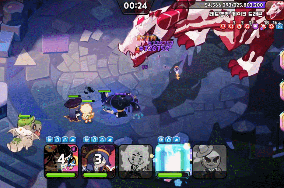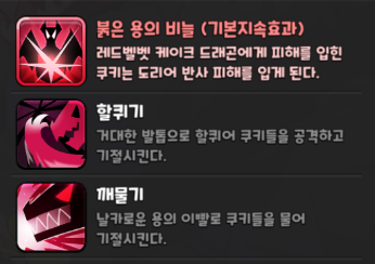 두 스킬은 랜덤하게 발동되나 보통 깨물기를 먼저 시전해서 전체 쿠키에게 기절을 입히고 드래곤 브레스로 전체 쿠키를 한 번에 녹이는 구조입니다. 깨물기 역시 모션은 다르지만 기존 메커니즘은 동일하다고 볼 수 있습니다.