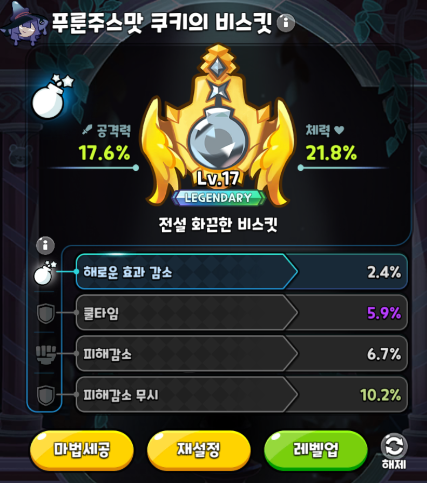 서브딜러인 푸룬주스입니다. 해당 덱에 탱커가 없다보니 소환수를 몸빵으로 두고 로얄마가린의 딜을 펌핑시켜주는 무척 고마운 쿠키입니다. 소환수가 중독 효과가 있다보니 독뎀에 아주 최적인데요, 메인딜러인 마가린 쿠키의 독성 공격과 조합이 매우 좋아 레드벨벳 드래곤을 순식간에 녹일 수 있습니다. 다만 탱커 역할인 소환수를 빨리 소환해야 하므로 쿨타임 위주의 세팅이 필요합니다.