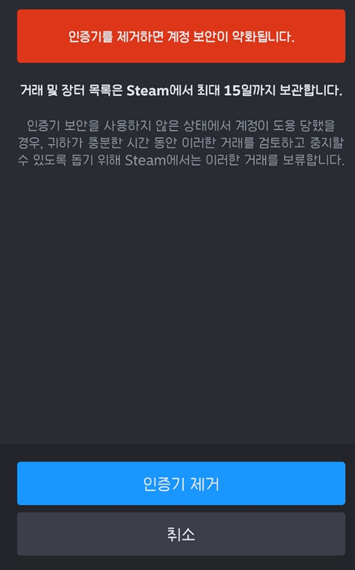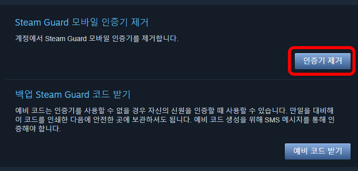 스팀 가드 인증 제거를 누릅니다. 스크린샷에서는 모바일 인증기 제거라고 뜨는데 본인이 설정한 스팀 가드 종류에 따라서 저 글씨가 다르게 노출됩니다. 참고로 PC 메일 인증으로 하신 분들의 경우 메일 코드 제거라는 텍스트로 뜹니다.