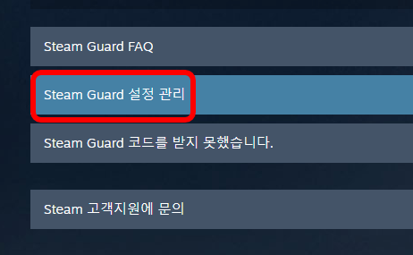 계정 탭 -> 스팀 가드 -> 설정 관리로 이동합니다. 참고로 스팀 가드 코드를 잊을 경우 가입 당시 복구 코드를 따로 확인할 수 있는데요, 이 부분은 다른 포스팅에서 따로 다루도록 하겠습니다.